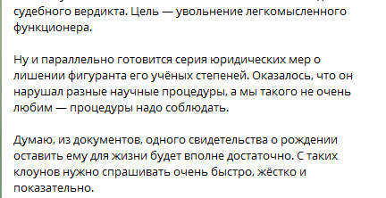 "Думаю, из документов одного свидетельства о рождении оставить ему для жизни будет вполне достаточно. С таких клоунов нужно спрашивать очень быстро, жёстко и показательно", - резюмировал Портнов.