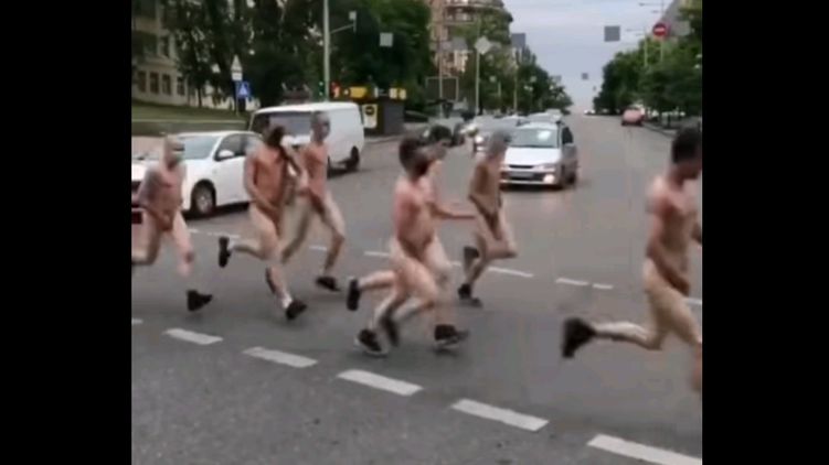 В соцсети Facebook утром 24 мая появился видеоролик с десятком  мужчин, которые непринужденно бегут голыми по центру Киева. На бегунах надеты только медицинские маски, носки и обувь. Причинные места атлеты прикрывают руками.
