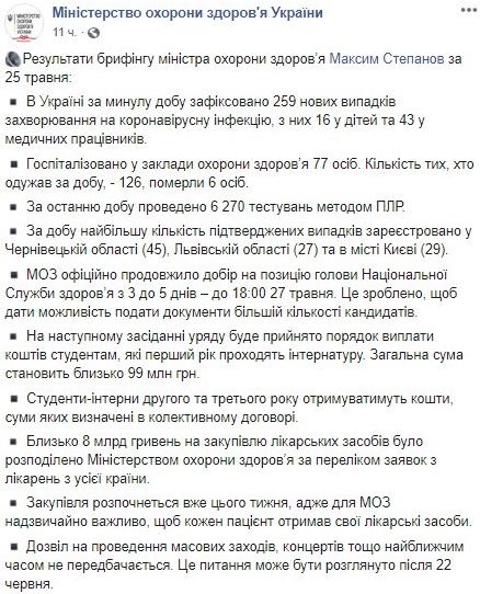 "В Украине за минувшие сутки зафиксировано 259 новых случаев заболевания коронавирусной инфекцией, из них 16 у детей и 43 у медицинских работников. Госпитализированы в учреждения здравоохранения 77 человек. Количество тех, кто выздоровел за сутки, - 126, умерли 6 человек. За последние сутки проведено 6270 тестов методом ПЦР", - заявил он.
