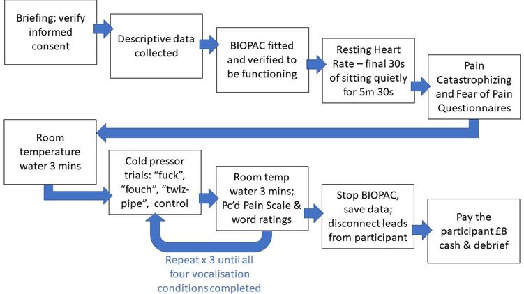 Поэтому исследователи Килского университета Ричард Стивенс и Олли Робертсон решили провести эксперимент с тремя словами: fouch, которое вызывает эмоциональную реакцию, ругательством fuck и выдуманным, но забавным словом twizpipe. Они попросили 92 добровольца опустить руку в контейнер с водой температуры от 3 до 5 градусов, оповестить о моменте, когда начиналась боль и продержать конечность максимально долго, пока боль не станет невыносимой. При этом испытуемым нужно было повторять одно из выбранных слов.