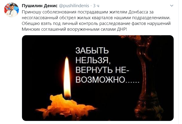 "Приношу соболезнования пострадавшим жителям Донбасса за несогласованный обстрел жилых кварталов нашими подразделениями. Обещаю взять под личный контроль расследование фактов нарушений Минских соглашений вооруженными силами ДНР!" - говорится в записи.