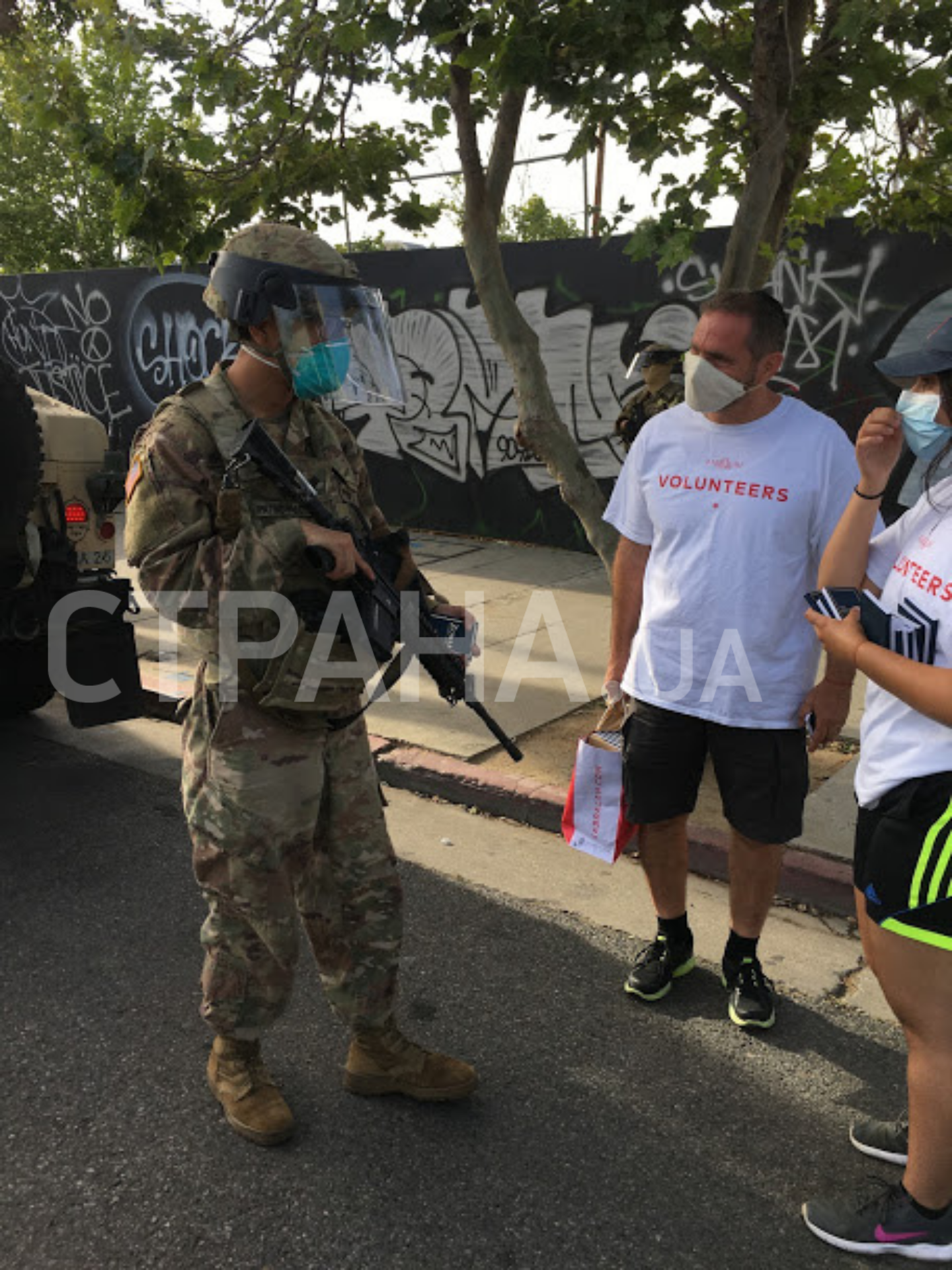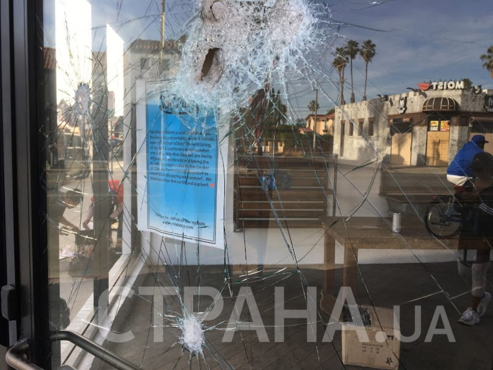 Мелроуз-авеню в Голливуде оцеплена полицией и нацгвардией. Улица почти вся заколочена, а некоторые магазины после поджогов все еще стоят без окон.