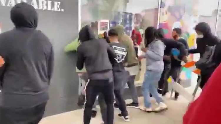 Как видно на записи, толпа людей, направляясь по улице, дошла до здания, где располагается галерея современного искусства. Ногами и подручными предметами мародеры выбили окна заведения и начали выносить все подряд. Несколько человек безуспешно пытались им помешать.