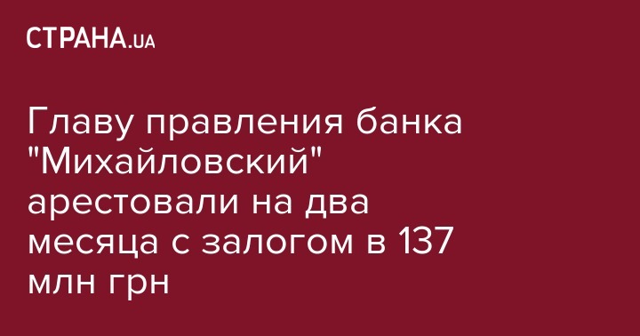 "Шевченковский районный суд Киева избрал меру пресечения бывшему председателю правления ОАО "Банк Михайловский", который подозревается в хищении 870 млн гривен банковских средств и доведении банка до неплатежеспособности. Суд определил для задержанного служащего меру пресечения в виде двух месяцев ареста с альтернативой внесения залога в размере 137,8 млн грн", - сказано в сообщении.