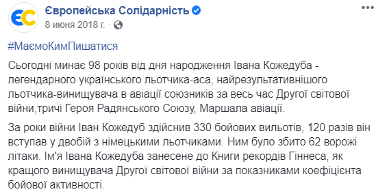 "2072 украинца стали Героями Советского Союза, легендарный летчик Иван Кожедуб, который сбил 64 фашистских самолета, стал трижды Героем. Четыре оперативно-стратегических объединения Красной Армии, созданные в 1943 году, носили названия Украинских фронтов", – заявлял Порошенко 8 мая 2015 года.