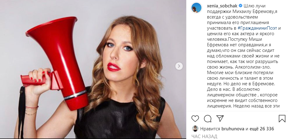 А вот телеведущая Ксения Собчак пишет, что "шлет Ефремову лучи поддержки".