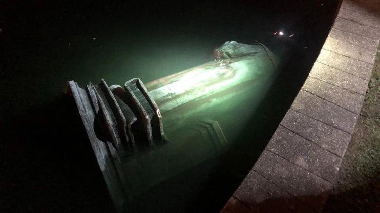 Затем на монумент набросили веревки и повалили его. После чего статую оттащили к расположенному рядом озеру и скинули на дно.
