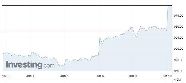 Так, по состоянию на 17:55 по Киеву бумаги выросли на 6,52% — до $1002,2. Максимальное значение в течение торговой сессии составило $1011,65. Общая стоимость компании превысила $185,5 млрд.