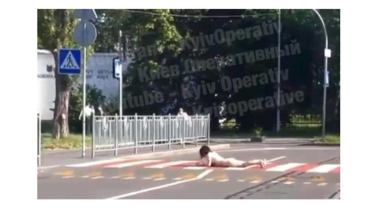Сегодня, 11 июня, в Киеве произошло пикантное ЧП. На одной из улиц столицы прохожие стали свидетелями того, как обнаженная женщина очень необычным способом пересекала проезжую часть дороги.