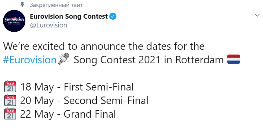 "Мы рады объявить даты "Евровидения 2021", который пройдет в Роттердаме. 18 мая - первый полуфинал, 20 мая - второй полуфинал, 22 мая - большой финал конкурса", - говорится в сообщении, опубликованном в соцсетях конкурса.