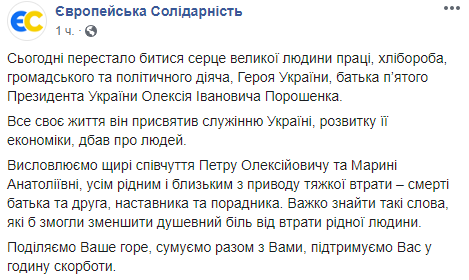 "Сегодня перестало биться сердце большого человека труда, земледельца, общественного и политического деятеля, Героя Украины, отца пятого Президента Украины Алексея Ивановича Порошенко.