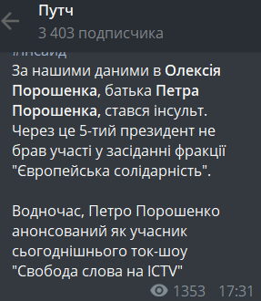 "По нашим данным у Алексея Порошенко, отца Петра Порошенко, случился инсульт. Поэтому 5-й президент не участвовал в заседании фракции "Европейская солидарность". В то же время Петр Порошенко анонсирован как участник сегодняшнего ток-шоу "Свобода слова на ICTV", - написал канал в 17:30 по киевскому времени.