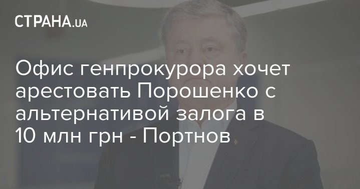 "Офис генерального прокурора ходатайствует перед судом о взятии Порошенко под стражу с альтернативой залога в 10 миллионов гривен по делу, в котором ему ГБР вручило подозрение", - написал Портнов.