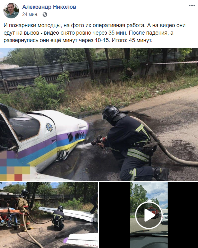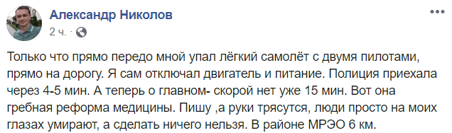 "Только что прямо передо мной упал легкий самолет с двумя пилотами, прямо на дорогу. Я сам отключал двигатель и питание. Полиция приехала через 4-5 мин. А теперь о главном - скорой нет уже 15 мин. Вот она гребаная реформа медицины. Пишу, а руки трясутся, люди просто на моих глазах умирают, а сделать ничего нельзя. В районе МРЭО 6 км", - написал очевидец случившегося.