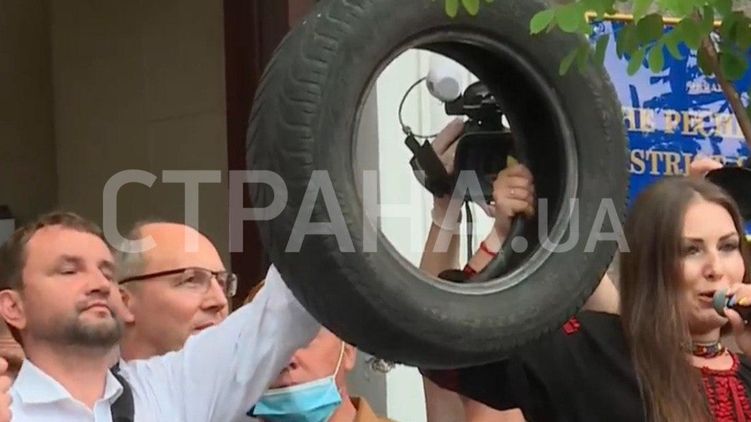 Под зданием Печерского районного суда Киева, где избирают меру пресечения бывшему президенту Петру Порошенко по делу о назначении Семочко, нардеп и экс-глава Института нацпамяти Владимир Вятрович вынес автомобильную покрышку.