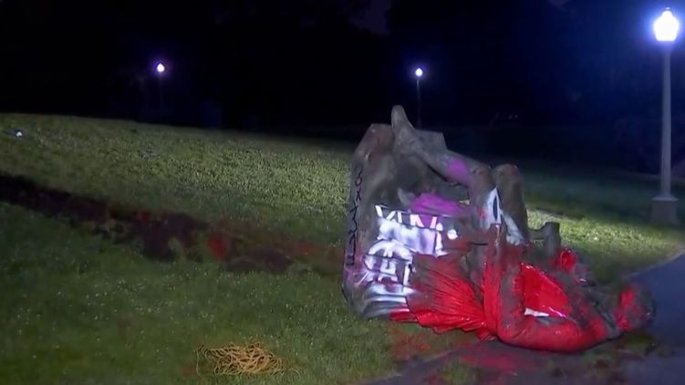 Протестующие в США снесли памятник автору гимна и 18 президенту. Фото: Скриншот видео / NBC Bay area