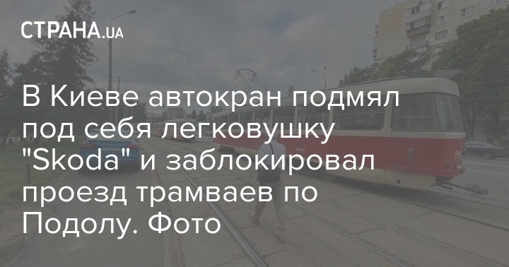 В Киеве автокран подмял под себя легковушку "Skoda" и заблокировал проезд трамваев по Подолу. Фото