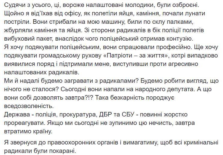 По данным полиции, около 16.00 националисты начали догонять нардепа после его отъезда. В защиту Литвиненко выступили его сторонники. Тогда и начались столкновения.