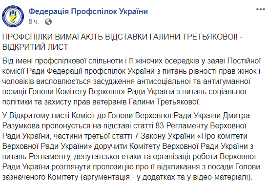"От имени профсоюзного сообщества и ее женских организаций ... высказывается осуждение антисоциальной и антигуманной позиции Председателя Комитета Верховной Рады Украины по вопросам социальной политики и защиты прав ветеранов Галины Третьяковой", - говорится в сообщении ФПУ.