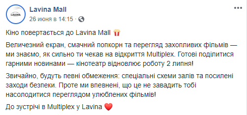 Киевские кинотеатры анонсировали открытие с 2 июля. Они откроются с ограничениями. Заполняемость залов кинотеатров не должна превышать 50%.
