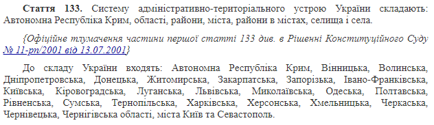 Отметим, что согласно статье 133 Конституции в административном отношении территория Украины включает 27 регионов — 24 области, Автономная Республика Крым и два города, имеющие специальный статус - Киев и Севастополь.