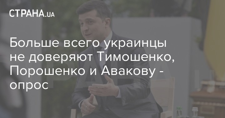 В тройку политиков, которым доверяют менее всего входят министр внутренних дел Арсен Аваков - 77% недоверия против 13% доверия. Лидеру ВО "Батькивщина" Юлии Тимошенко 79% и 14% соответственно, а экс-президенту и нардепу от "Европейской солидарности" Петру Порошенко 77% и 17% соответственно.