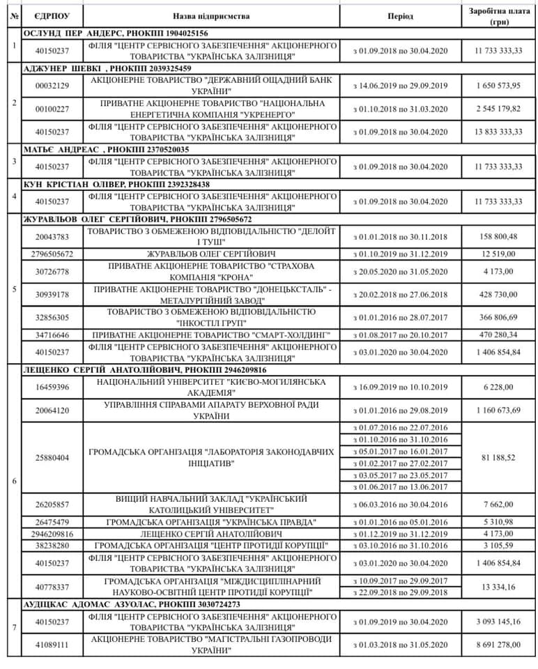 Олег Журавлев и Сергей Лещенко - единственные украинцы в набсовете "УЗ" - за первые четыре месяца 2020-го получили почти по полтора миллиона. Каждый месяц их зарплата составляла в среднем 350 тысяч гривен.
