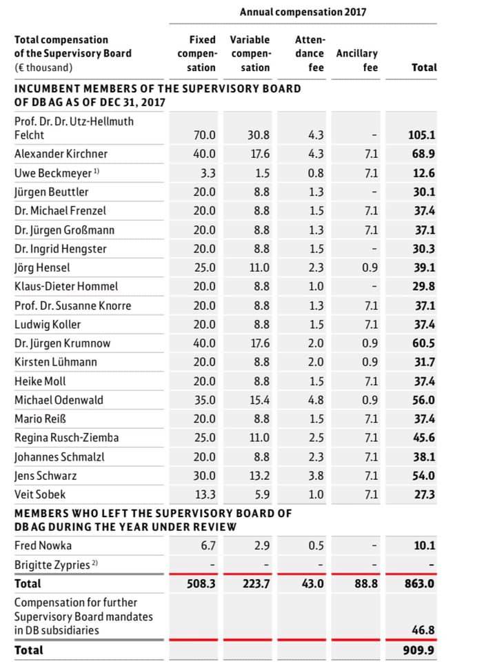 Вот если говорить про Deutsche Bahn. Самый большой оклад в 2017 получил Председатель Наблюдательного совета Utz-Hellmuth Felcht - 105 тысяч евро за год.