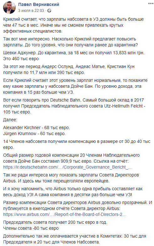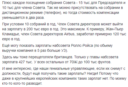 "Если Криклий считает этот уровень зарплат нормальным, то покажите ему, какие зарплаты у набсовета "Дойче Бан". По уровню дохода эта компания в 15 раз больше, чем УЗ.