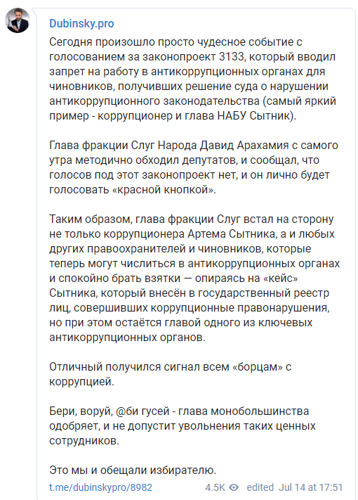 "Сегодня произошло просто чудесное событие с голосованием за законопроект 3133, который вводил запрет на работу в антикоррупционных органах для чиновников, получивших решение суда о нарушении антикоррупционного законодательства (самый яркий пример - коррупционер и глава НАБУ Сытник).