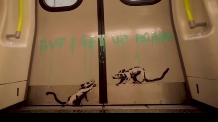 На опубликованном художником видео можно рассмотреть одну чихающую крысу, а вторую - с медицинской маской, которую она использует как парашют. Еще парочка изображена на дверях вагона.