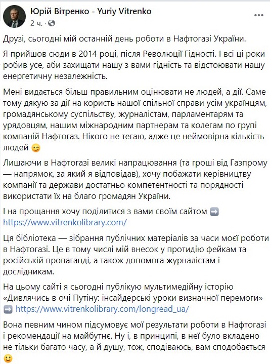 "Друзья, сегодня мой последний день работы в "Нафтогазе Украины". Мне представляется более правильным оценивать не людей, а действия. Именно поэтому спасибо за действия в пользу нашего общего дела всем украинцам, гражданскому обществу, журналистам, парламентариям и чиновникам, нашим международным партнерам и коллегам по группе компаний Нафтогаз. Оставляя в Нафтогазе большие наработки (и деньги от Газпрома - направление, за которое я отвечал), хочу пожелать руководству компании и государства достаточно компетентности и порядочности использовать их на благо граждан Украины", - написал Витренко, отправивший всю свою многомиллионную премию за победу в Стокгольмском арбитраже жене в Лихтенштейн.