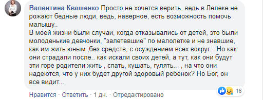 Мы долго беседовали. Приводили аргументы. Объясняли. Бесполезно. Теперь ребенок лежит в Лелеке. Один. И на свете у него никого нет кроме Лелеки. И имя для свидетельства о рождении ему дала Лелека.