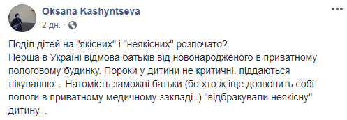 "Разделение детей на "качественных" и "некачественных" начато? Первый в Украине отказ родителей от новорожденного в частном роддоме. Пороки у ребенка не критичны, поддаются лечению... Зато состоятельные родители (кто же еще позволит себе роды в частном медицинском учреждении ..) "отбраковали некачественного" ребенка ..."