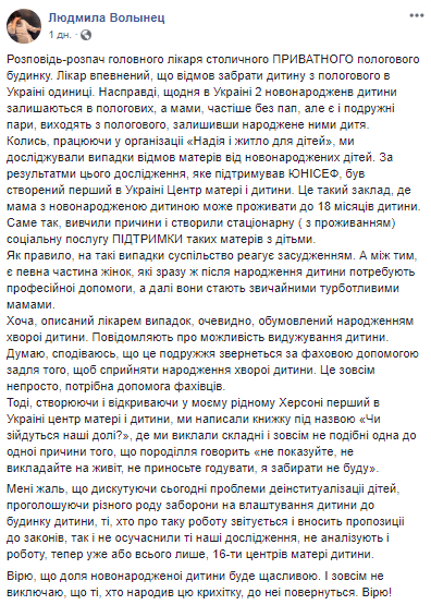 Бывший директор Госдепартамента по усыновлению и защите прав ребенка Людмила Волынец написала, что каждый день в Украине оставляют двух детей в роддомах, но она верит в счастливую судьбу девочки.