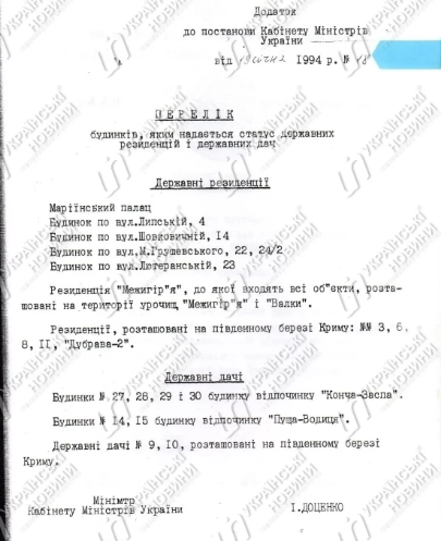Перечислять резиденции Госуправление делами отказалось, сославшись на постановление Кабмина №18 от 19 января 1994 года, которым утверждается, что перечень дач и резиденций, до сих пор находится под грифом "Для служебного пользования".