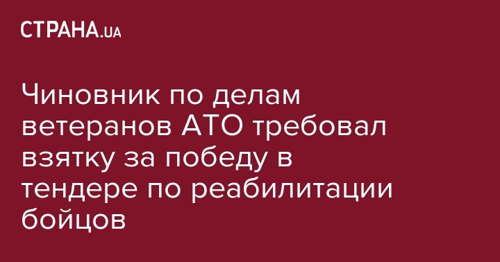 Прокуратура Киева совместно со Службой безопасности Украины задержали чиновника Государственной службы по делам ветеранов войны и участников антитеррористической операции (АТО) при получении 230 тыс. гривен взятки. Деньги от коммерческой структуры должны были стать залогом победы этой фирмы в тендере по психологической реабилитации участников АТО.
