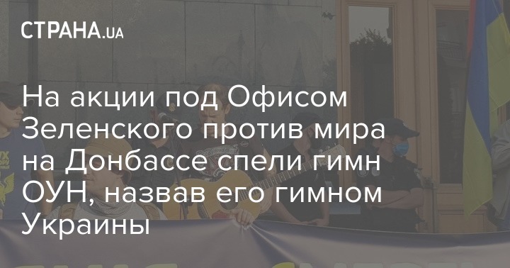 Под Офисом президента Владимира Зеленского в Киеве проходит митинг "Европейской солидарности" против перемирия на Донбассе. Один из его участников призвал собравшихся спеть гимн Украины, после чего включили фонограмму "Марша украинских националистов" - официального гимна ОУН.