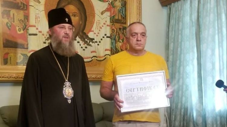 Владыка Антоний вручил сертификат на 270 тысяч председателю правления международной благотворительной организации "Международная медицинская помощь" Илье Богомолову.