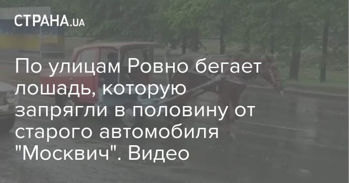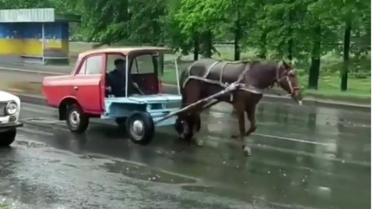 На улицах Ровно был замечен странный транспорт: конь, запряженный в повозку, сделанную из половины корпуса старого советского автомобиля марки "Москвич".