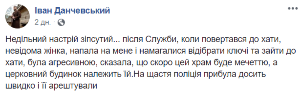 "После службы, когда возвращался домой, неизвестная женщина напала на меня и пыталась отобрать ключи и зайти в дом. Была агрессивной, сказала, что скоро этот храм будет мечетью, а церковный дом принадлежит ей. К счастью, полиция прибыла достаточно быстро и ее арестовали", - написал отец Иван.