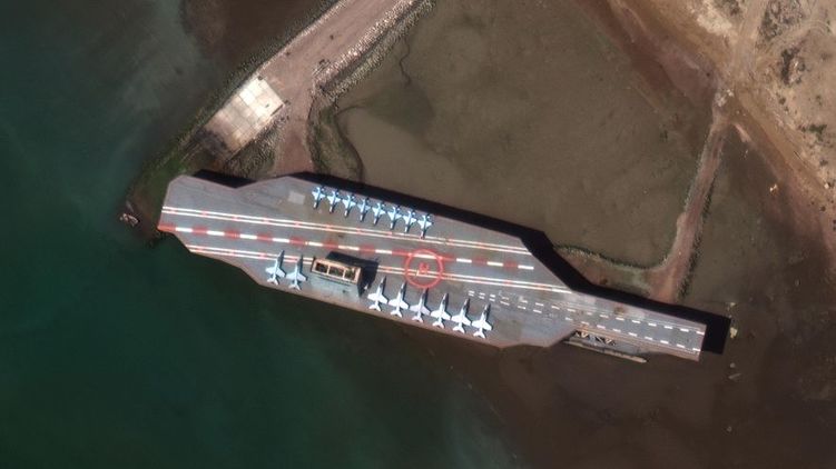 Если реальный авианосец типа "Нимиц" составляет 300 м в длину и 75 м - в ширину, его иранская копия имеет 200 м в длину и 50 в ширину. На палубе модели корабля были расположены 16 моделей самолетов.