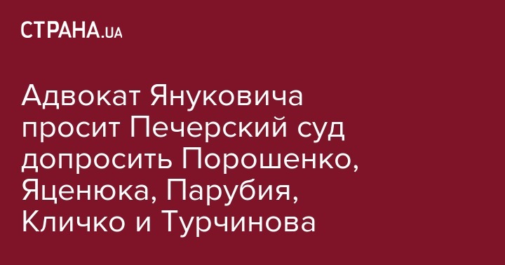 Адвокат экс-президента Украины Виктора Януковича Виталий Сердюк просит Печерский районный суд Киева провести допрос в качестве свидетелей президента Украины Петра Порошенко, экс-премьер-министра Арсения Яценюка, председателя Верховной Рады Андрея Парубия, мэра Киева Виталия Кличко, секретаря СНБО Александра Турчинова при участии своего клиента в режиме видео-конференции.
