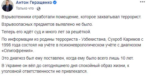 13:39  Личность террориста пока не установлена. Замглавы МВД Антон Геращенко не исключил, что с ним поступят, как с его полтавским "коллегой".