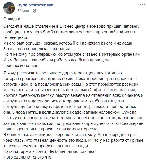 "Сегодня в наше отделение в бизнес-центр "Леонардо" пришел человек, сообщил, что у него бомба, и выставил условия про онлайн эфир на телевидении. У него был большой рюкзак, который он привязал к ноге, и чемодан. 3 часа шла полицейская операция. Но я не хочу про операцию, об этом уже сказано в интервью органами. И им большое спасибо за работу - все было проведено профессионально. Я хочу рассказать про нашего директора отделения Наталью. Которая среагировала молниеносно.