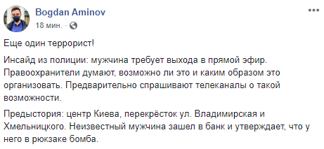 Мы пока не знаем, насколько серьезными являются его намерения и действительно ли у него настоящая взрывчатка", - пишет Антон Геращенко.