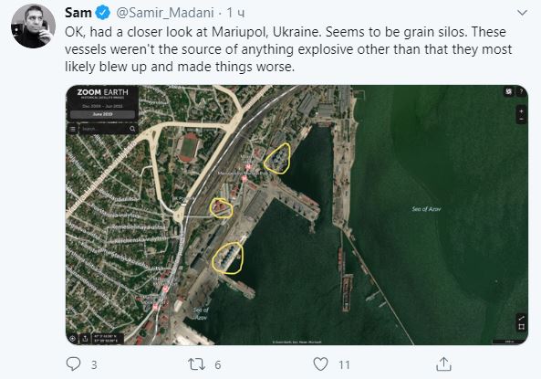 Позже Мадани удалил этот твит. И написал, что ошибся. "Окей, ознакомился с Мариуполем, Украина. Кажется, это зернохранилища. Эти суда не были источником взрыва, кроме того, что они, скорее всего, взорвались и усугубили ситуацию" - написал он.