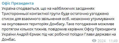 "Мы надеемся, что на ближайших заседаниях Трехсторонней контактной группы будут окончательно согласованы списки по обмену. Мы надеемся, что в течение нескольких недель сможем говорить о конкретных датах по обмену", - сказал Ермак.