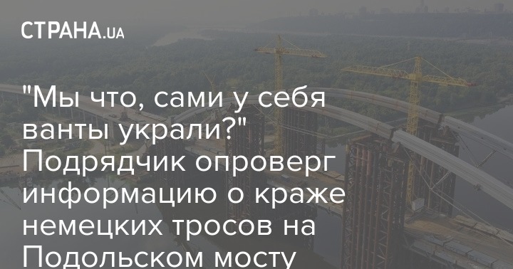 Он утверждает, что "Эко-буд-трейд" саботирует строительство моста. Сумма долга генподрядчика перед Инжиниринговой мостовой компанией около 200 млн грн. В нее входит и стоимость тех самых вант, которые, по заявлению генподрядчика, украли с Подольского моста.