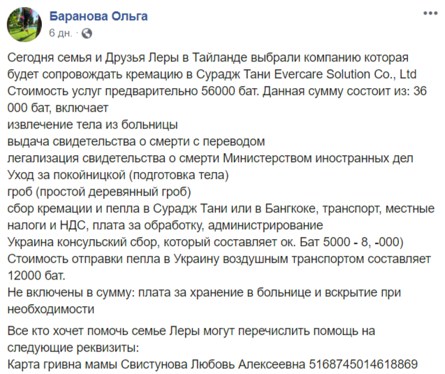 В посте знакомой погибшей Ольги Барановой говорится, что семья и друзья Леры в Тайланде выбрали компанию, которая будет сопровождать кремацию в Сурадж Тани. При этом предварительная стоимость услуг составит около 56000 бат. (около 50 тысяч грн.)